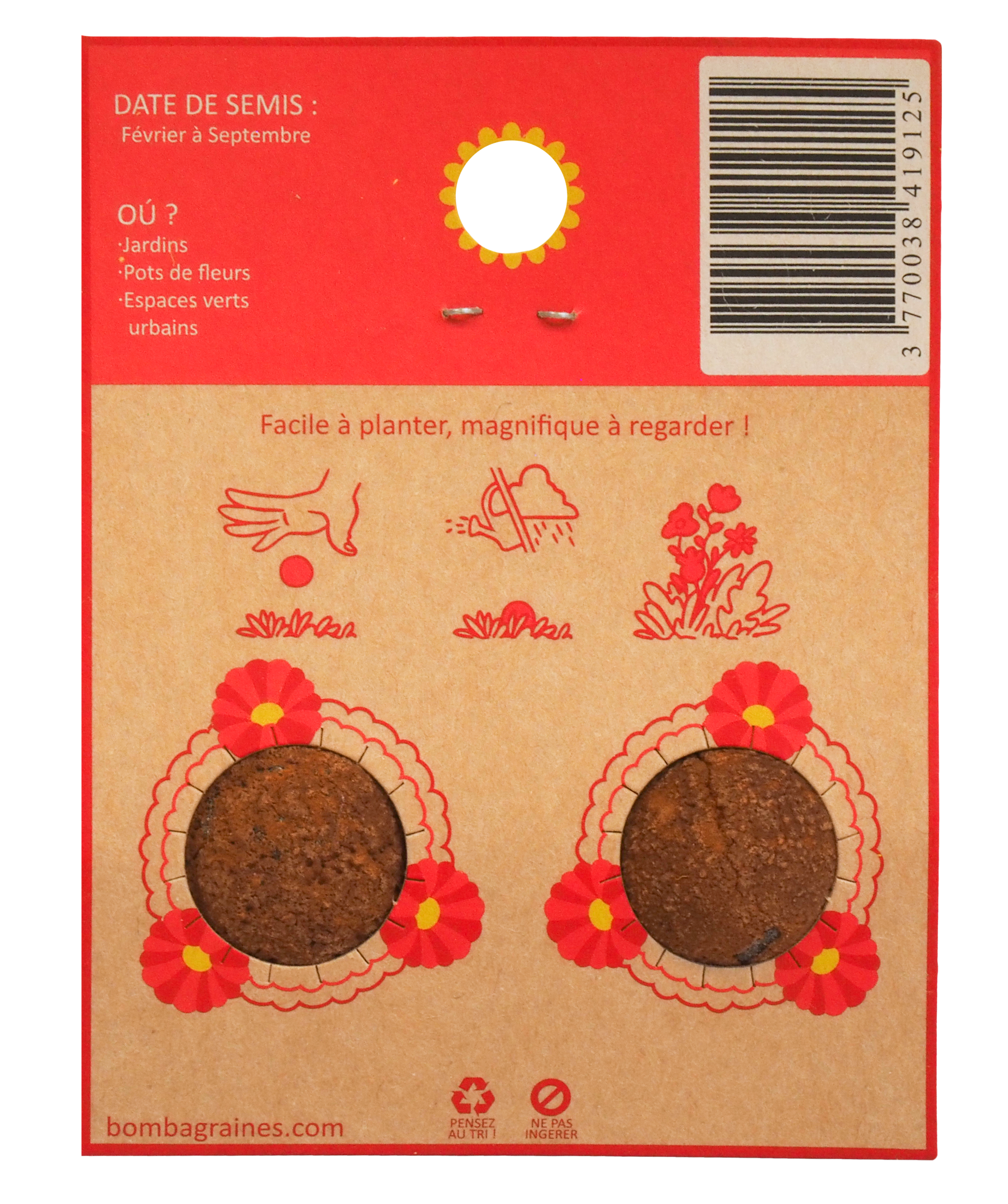 - Choisissez la couleur des fleurs que vous préférez ! La couleur de la bombe de graines correspond à la couleur de vos futures fleurs. La Bombalove se compose uniquement de fleurs rouges.