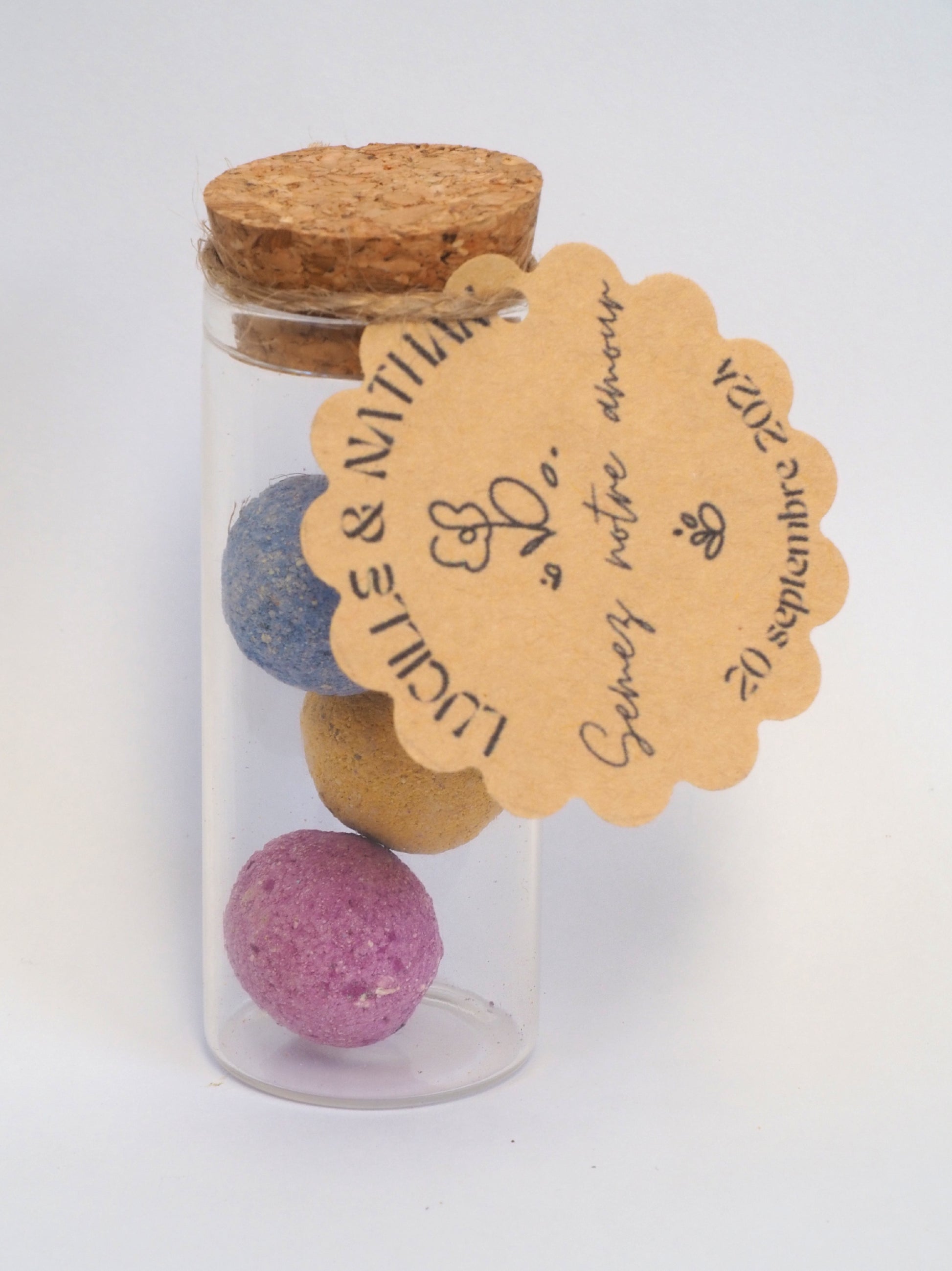 Fiole en verre de 3 bombes de graines + étiquettes personnalisables pour vos événements.